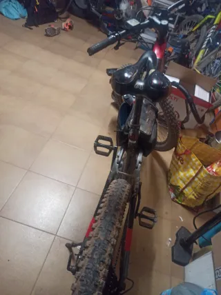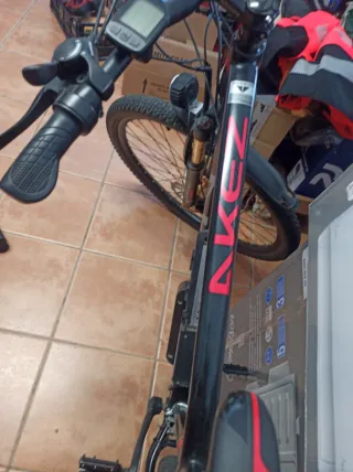 Bicicleta de montaña con diseño deportivo. - Cuadro de color negro con detalles en rojo. - Ruedas de montaña. - Manillar con pantalla digital.