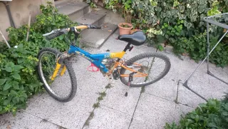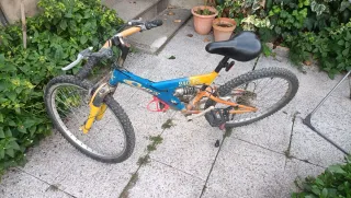 Bicicleta de montaña con suspensión delantera y trasera. - Cuadro azul y amarillo. - Ruedas todoterreno. - Sillín negro. - Pedales. - Frenos. -26 pulgadas, ideal para niñ@s se 9 a 11 años