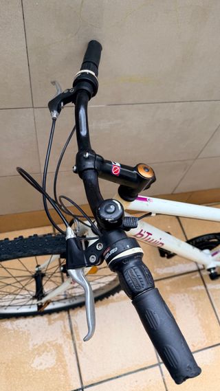 Bicicleta de montaña Rockrider Btwin en color blanco con detalles en rosa y morado. Diseñada para niñas. - Cuadro de aluminio. - Ruedas de 24 pulgadas. - Frenos V-brake. - Cambio Shimano de 7 velocidades. 3 platos 7 piñones marchas funciona bien Frenos revisado ruedas nuevas En muy bien estado puedes aprobar
