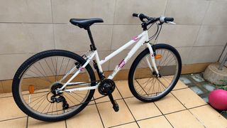Bicicleta de montaña BTWIN ROCKRIDER 5.0 con ruedas de 26 pulgadas. - Color blanco y rosa - Modelo Rockrider 5.0. - Tamaño de rueda: 26 pulgadas. 3 platos 7 piñones 21 marchas Cambio trasero de shamon es nuevo con cable frenos funciona bien puedes aprobar sillas puedes ajustar Ruedas cambio hace poco Gracias