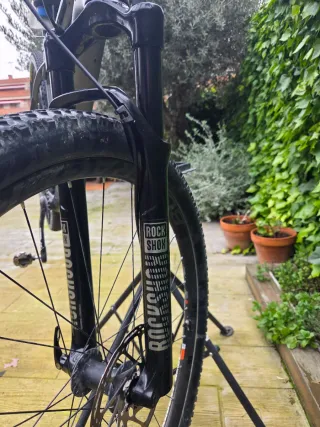 RockShox SID RL, Solo Air, bloqueo remoto Motion Control, tubo de la horquilla perfilado E2, geometría G2 con avance de 51 mm en las 29ers, Boost110, 100 mm de recorrido. 0 kilómetros después de la revisión (retenes, aceites etcétera) puedo enseñar factura del 27/01/2026. Vinilos nuevos, al despegarse los originales. Ninguna rayada o desperfecto. Montada en una Trek Procaliber SL talla L y tubo a unos 18 cm. Sin mando bloqueo.