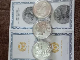 Conjunto de monedas de plata de Germania Mint. - Monedas con diseño de Fafnir - Moneda con diseño de Fenrir. - Moneda con diseño de Gullinbursti. - Incluye certificados de autenticidad. Serie exclusiva con gran revalorización Se entregan las 3 piezas de las fotos. Mire mi perfil