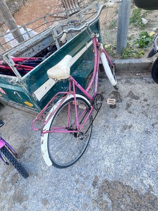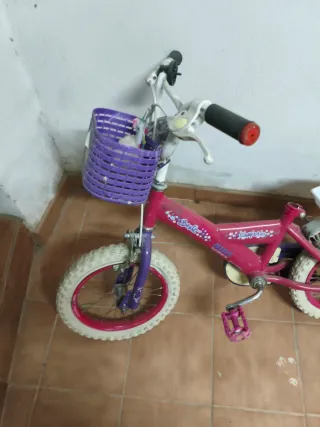 Bicicleta infantil en color rosa con detalles morados y cesta. Dispongo del sillón ,hay que inflar las ruedas . - Ruedas blancas. - Puños negros y rojos. - Pedales rosas.