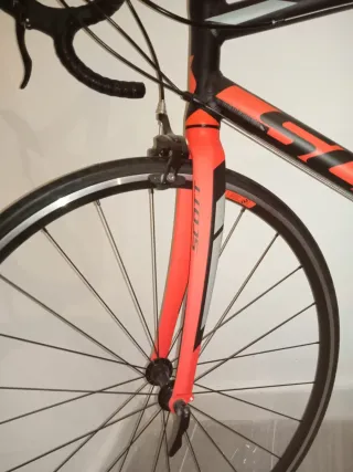 Bicicleta de carretera Scott Speedster en color negro y naranja. - Cuadro de aluminio. - Ruedas de 700c. - Frenos de disco.