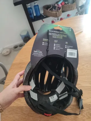 Casco de bicicleta TKX con diseño moderno y ventilado. - Diseño con rayas blancas y negras. - Interior con acolchado. - Correa ajustable.