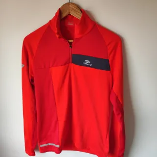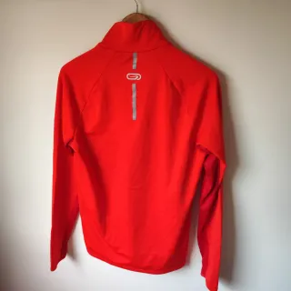 Camiseta deportiva de manga larga en color naranja, ideal para actividades al aire libre. - Marca: Kalenji. - Talla S. - Diseño con media cremallera. - Detalles reflectantes en la parte inferior.