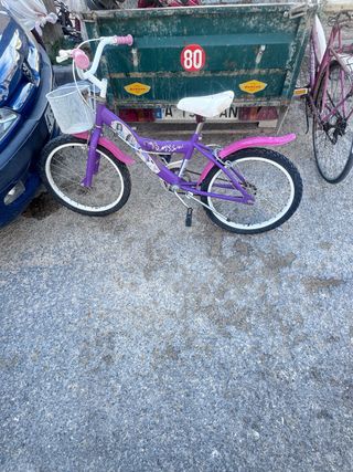 Bicicleta infantil de color morado, ideal para los más pequeños. Cuenta con una práctica cesta delantera. - Color: Morado y rosa. - Cesta blanca. - Ruedines no visibles. 30€ las 2 vicis