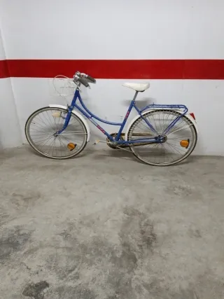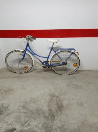 Bicicleta de paseo en color azul, con cesta delantera y portabultos trasero. - Cesta de mimbre blanca. - Portabultos metálico. - Guardabarros blancos.