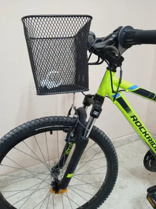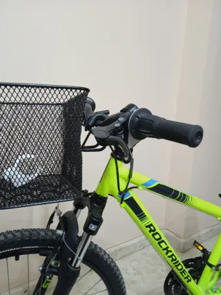 Bicicleta de montaña Rockrider en color verde lima. - Cesta delantera negra. - Ruedas todoterreno. - Suspensión delantera -Llantas 1,95x24" aún con los tacos intactos -esta perfecta de todo