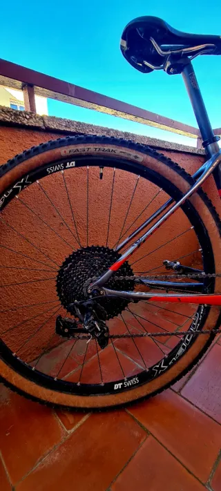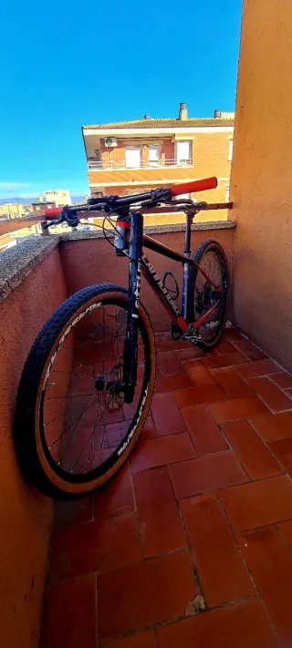 Bicicleta Massi Pro Carbon con ruedas de 29 pulgadas. - Cuadro de carbono. - Color rojo. - Horquilla de suspensión delantera Fox con mantenimiento acabado de hacer aceite y retenes. Mono plato y 11v . Cassette nuevo y cadena nueva. Cambiado liquido de frenos. Talla M Tija telescopica con mando en el manillar. Neumáticos onza porcupine blancos. Cambio xt. Típicas marcas de uso en una bici de montaña. #shimano#mountainbike#btt#fox#onza#sram#specialized#cannondale#yeti#massi#fullcrum#carbono#
