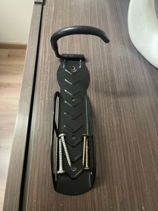 Soporte de pared para colgar bicicletas. Incluye los tornillos necesarios para su instalación. - Material: Metal resistente. - Color: Negro. - Diseño robusto.