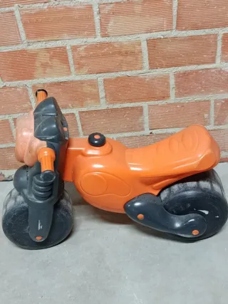 Moto de juguete de plástico en color naranja y gris. Ideal para que los más pequeños se diviertan. - Diseño tipo motocicleta. - Ruedas anchas para mayor estabilidad.
