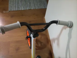 Bicicleta infantil con un diseño divertido y llamativo. Tiene zonas oxidadas. Los frenos funcionan y las ruedas tienen presión. - Marco de color blanco. - Ruedas con aro azul. - Manillar con puños de color