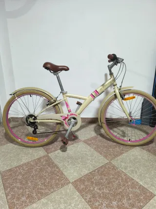 Bicicleta de la marca BTWIN, ideal para niñas y adolescentes. - Color crema con detalles en rosa y rayas. - Sillín marrón. - Ruedas con aro rosa. - Guardabarros delantero y trasero.