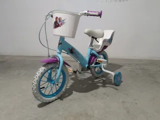 Bicicleta infantil de 16 pulgadas con temática de Frozen. Ideal para los más pequeños. - Color azul y morado. - Ruedines incluidos. - Cesta delantera. - Asiento trasero para muñeca.