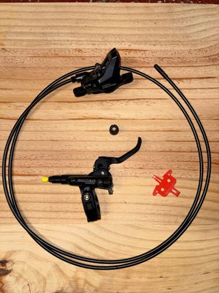 Freno de disco delantero Shimano M 6100. Nuevo sin usar, con pasrillas y latiquillo, listo para montar. Desmontado de bici nueva - Maneta de freno. - Pinza de freno.