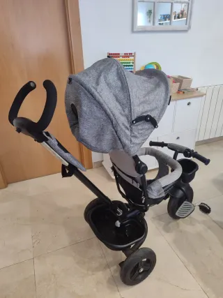 • Triciclo para Correr con Barra de Empuje • Reposapiés plegable para niños pequeños. • Asiento Giratorio de 360°, podrás colocar el asiento orientado hacia delante o hacia atrás. • Manillar para Padres con Altura Ajustable (4 niveles) • Capota grande para proteger del sol • Cinturon de seguridad • De 9 Meses a 5 años • Color Gris • Accesorios: 2 cestas, timbre y bolsa en el manillar superior •Ruedas antipinchazos • Función de rueda libre ( el niño puede pedalear sin propulsar el triciclo)