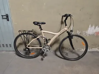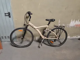 Bicicleta B-Twin original en color beige. Ideal para paseos y desplazamientos urbanos. - Cuadro de aluminio. - Suspensión delantera y trasera. - Portabultos trasero Blackburn. - Ruedas de 700c. Poquísimo uso en perfecto estado.