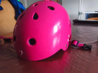 Casco de protección en color rosa,de la marca Oxelo, diseñado para niñas. Cuenta con correas ajustables para un ajuste seguro. - Color: Rosa vibrante. - Diseño ventilado con múltiples orificios. - Cierre de hebilla. - Detalle de corazón blanco en la parte frontal. Talla cabeza 50-54 cm.