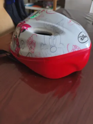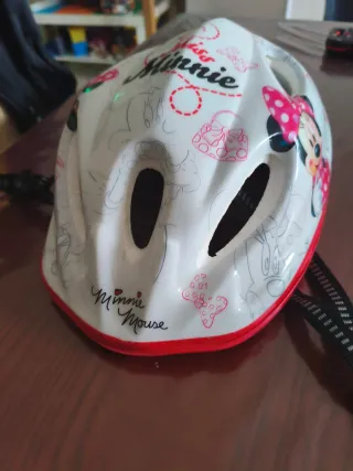 Casco de protección infantil con diseño de Minnie Mouse. - Estampado de Minnie Mouse y accesorios. - Color blanco con detalles en rojo y rosa. - Cierre de seguridad. -Talla 52-56 cm.