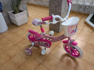 Bicicleta infantil en color rosa, ideal para las primeras aventuras. - Diseño con canasta delantera. - Ruedines de apoyo incluidos. - Asiento y manillar decorados con motivos infantiles.