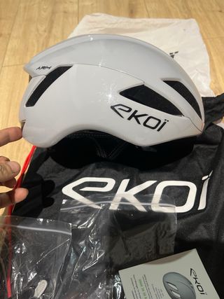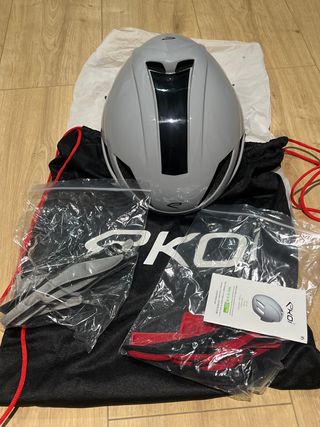 Casco de ciclismo Ekoi AR14 en color gris. Incluye bolsa de transporte y accesorios. - Diseño aerodinámico. - Color gris con detalles en negro. - Bolsa de transporte negra con cordones rojos. - Accesorios adicionales en bolsas de plástico.