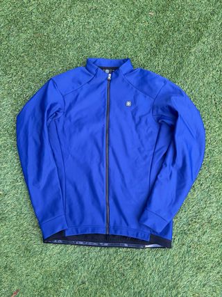 Chaqueta de ciclismo Btwin en talla 2XL. Diseño moderno con paneles de malla en los hombros. - Color principal azul con detalles en blanco y negro. - Cremallera frontal completa. - Bolsillos laterales con cremallera.