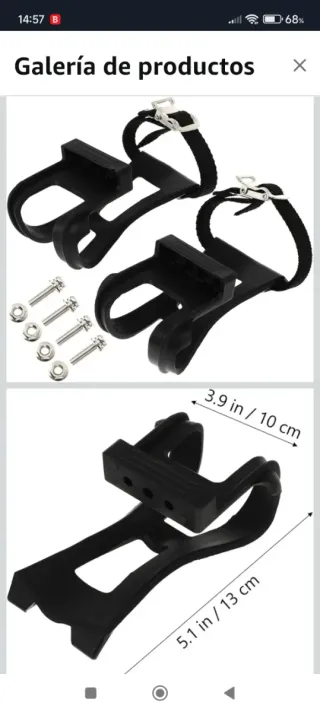 Juego de sujetadores para pedales de bicicleta, diseñados para mejorar la sujeción y el rendimiento. - Incluye 2 sujetadores de pedal. - Fabricados en plástico negro resistente. - Cuentan con correas ajustables. - Vienen con tornillos y tuercas para su instalación.