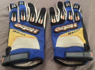 CIERRE VELCRO Y PROTECCIONES NUDILLOS Y DEDOS. ALGUNOS DEDOS GASTADOS POR EL USO. Guantes de la marca Hebo, modelo Intro, en talla L. Diseñados para la práctica de ciclismo y motocross. - Color azul con detalles en amarillo y blanco. - Paneles de malla para ventilación. - Cierre ajustable en la muñeca. - Protecciones en los nudillos.