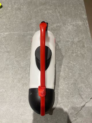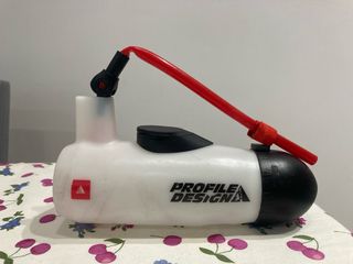 Bidón de hidratación para triatlón y ciclismo. - Marca: Profile Design. - Color: Blanco y negro. - Tubo de hidratación rojo. Se le ha incorporado un imán para sujetar el tubo. Se puede anclar con cualquier portabidón abierto.
