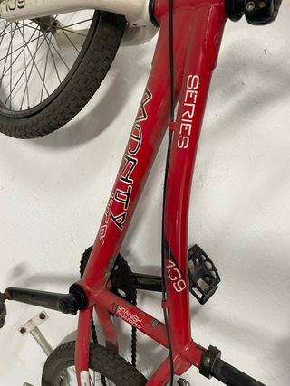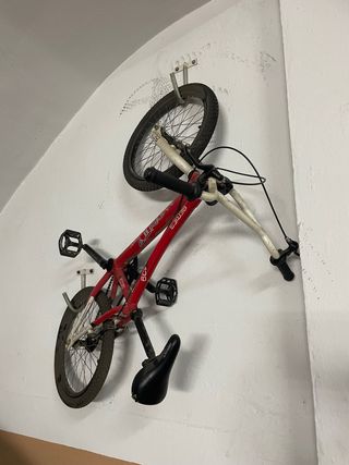 Bicicleta de estilo BMX, ideal para trucos y diversión. - Cuadro de color rojo. - Ruedas todoterreno. - Manillar blanco.