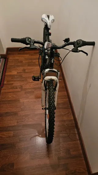 Bicicleta Maverick de montaña, talla 26, en buen estado. - Cuadro blanco con detalles rojos. - Ruedas de 26 pulgadas. - Incluye portabidón azul.
