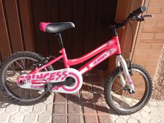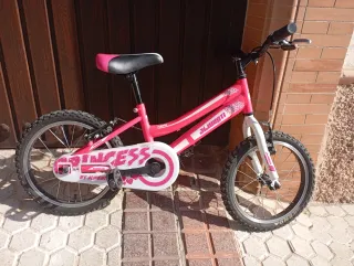 Bicicleta infantil de color rosa con detalles blancos y negros. Ideal para los más pequeños. Prácticamente sin uso, solo ver los pelos de nuevo de las ruedas. - Diseño Princess. - Ruedas de 16 pulgadas. - Marca Jl wenti Princess - Incluye ruedines.
