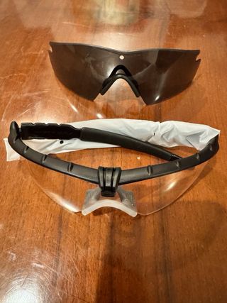 Set de gafas tácticas de protección balística Oakley. Incluye estuche rígido y accesorios. - Lentes intercambiables, ( Oscuras y Transparentes ) - Estuche de transporte. - Paño de limpieza. -Limpiador anti-vao