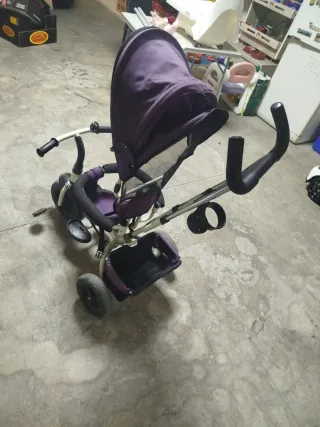 Triciclo infantil en color morado, ideal para paseos. - Asiento acolchado. - Capota protectora. - Manillar con empuñaduras. -EL manillar mueve la direccion