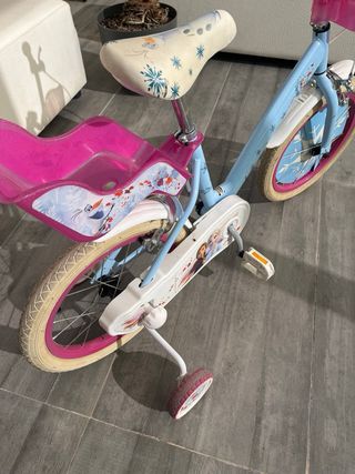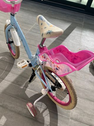 Bicicleta de paseo para niñas con un diseño divertido. - Color azul y rosa. - Incluye ruedines. - Asiento y cesta decorados con personajes.