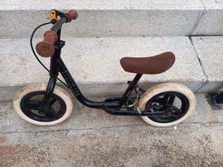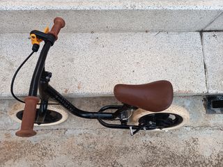 Bicicleta de aprendizaje sin pedales, ideal para los más pequeños. Color negro. - Manillar con puños marrones. - Sillín marrón. - Ruedas blancas.