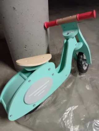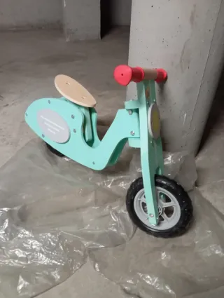Moto de equilibrio de madera, ideal para los más pequeños. Usada muy poco. Está prácticamente nueva. - Fabricada en madera. - Diseño tipo scooter. - Ruedas de goma. - Asiento de madera. - Puños de goma en color rosa.