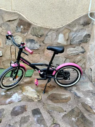 Bicicleta infantil B'Twin de 16 pulgadas, ideal para los más pequeños. Incluye ruedines, timbre, cesta y porta muñeca trasero. Perfecto estado, sin marcas de uso. - Diseño en color negro y rosa. - Ruedas con banda blanca. - Cadena protegida con cubre cadena. - Puños y pedales en color rosa.
