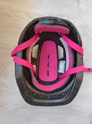 Casco de bicicleta en color rosa, ideal para niñas. Cuenta con un diseño ventilado y una etiqueta de talla. - Color: Rosa brillante - Talla: S (53-56 cm) - Diseño con ventilación