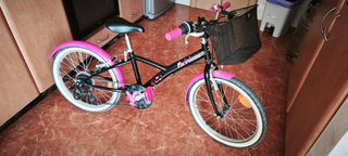 Bicicleta infantil BTWIN en color rosa y negro, ideal para niñas. - Ruedas de 20 pulgadas. - Incluye cesta delantera. - Guardabarros delantero y trasero. - Sillín negro con detalles rosas. - Puños rosas.