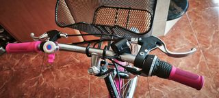 Bicicleta infantil de color rosa con detalles de flores y el número 200. - Cesta delantera rosa. - Marca QUER. - Se nota el uso en ella. Las ruedas están para arreglar.