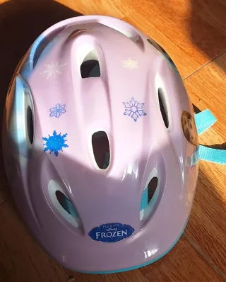 Casco de bicicleta para niña con diseño de Frozen. Ideal para proteger en paseos y actividades al aire libre. - Diseño con personajes de Frozen. - Colores: rosa, azul y blanco. - Correas ajustables para un ajuste seguro.