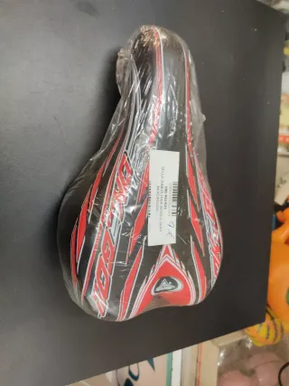 Sillín para bicicleta infantil con un diseño llamativo en negro y rojo. - Diseño deportivo. - Acolchado para mayor comodidad. - Compatible con bicicletas infantiles.