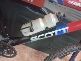 Bicicleta de montaña Scott con cuadro rojo y detalles azules y blancos. Ideal para disfrutar del ciclismo. - Cuadro de aluminio. - Ruedas de 26 pulgadas. - Frenos de disco. - Cambio Shimano. - Portabidón incluido.
