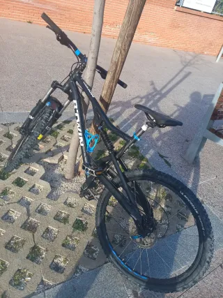 Bicicleta de montaña con doble suspensión en color negro. Lista para la aventura. - Cuadro de aluminio. - Horquilla delantera. - Amortiguador trasero. - Ruedas de 29 pulgadas. - Frenos de disco. etc...