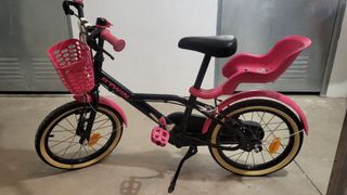 Bicicleta infantil Btwin en color rosa y negro, con cesta delantera y asiento trasero para muñecas. - Cesta rosa. - Asiento trasero rosa. - Pedales rosas. - Guardabarros rosas.
