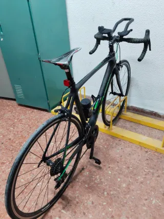 Bicicleta de carretera Olympia con cuadro de carbono. - Cuadro de carbono. - Diseño deportivo en negro y verde. - Incluye portabidón. Precio de venta en 2023 2200 euros Entrego equipo talla L de regalo y casco X 30 euros más doy zapatillas bh. Talla 44 Por este precio irrisorio, ya no necesitas nada más, te equipo para poder salir. NO ES NEGOCIABLE, SI POR 50 PREFIERES OTRA BICI, NO LO PIENSES, ESTA NO ES LA TUYA, GRACIAS