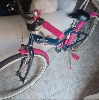Bicicleta infantil B'TWIN en color azul y rosa, ideal para niñas de 11 a 13 años. - Guardabarros delantero y trasero en color rosa. - Puños y pedales en color rosa. - Timbre plateado con detalles rosas.