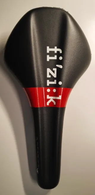 Sillín de bicicleta Fi'zi:k Antares Versus K:ium en color negro con banda roja. - Diseño ergonómico. - Raíles K:ium. - Marca: Fi'zi:k. - Largo 275 mm - Ancho 142 mm - Peso 239 gr - Cuero sintético y aluminio , con rebaje de alivio prostático 7 mm profundidad y hasta 30 mm de ancho. - En buen estado. Tiene dos pequeñas marcas de roce detrás y en un lado. Las bandas rojas tienes sendas grietas laterales que no afectan al sillín, solo a la pintura.